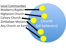 However, we have local expressions of that Church (all Christians) which I will call for clarity sake local communities of faith (think of the local church building where people meet; Mayberry Baptist Church). It is in these local communities of faith where we practice the sacraments of the Lord’s Supper and Baptism, where we offer our tithe, where we have officers such as elders and deacons. These local communities are segments of the larger Church or Body of Christ.